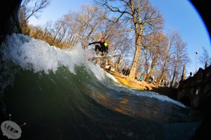 Schon im letzten Winter gab es viele Schnee-Surf-Sessions am Eisbach München. Dieser Winter ist die Steigerung: So eingeschneit ist die Eisbachwelle schon seit Jahren nicht mehr. Ganz München versinkt tagelang im Schnee. Und zwischen den Schneemassen an den Ufern brausen die Wassermassen über die Welle. Wassermassen. Endlich! Denn seit dem Spätsommer war der Wasserstand im Eisbach fast durchgehend so niedrig, dass die Welle meistens kraftlos war. So klein, dass die Eisbachwelle oftmals nur bedingt surfbar war. Während die einen Brettsportler monatelang auf den Schnee warten, warten die anderen monatelang auf mehr Wasser im Eisbach. Und dieser Winter beschenkt sie alle: Schneemassen und Wassermassen! Zwar fehlen immer noch ein paar Kubikmeter Wasser im Eisbach, aber die Welle hat guten Druck. Und das seit Wochen mit nur wenigen Unterbrechungen. Recht buckelig und wechselhaft ist die Form der Welle. So ist surfen auf dem Eisbach eine echte Herausforderung. Und oftmals bricht die Welle in der Mitte ein.